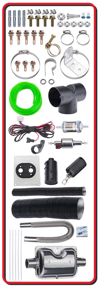 Komplekti kuulub: kütteagregaat, LCD-ekraaniga kontroller, õhufilter, kütusefilter, kütusepump, ühenduskaablid, kütusevoolik, paigaldusplaat tihendiga, suunav otsik, kaugjuhtimispult, summuti, torude komplekt, kruvide ja klambrite komplekt, poolakeelne kasutusjuhend.